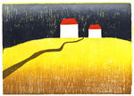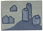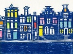 2015Een houtdruk in het blauw. De ramen en deuren zijn met waterverf ingekleurd.