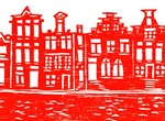 2014Houtsnede van huizen aan een kanaal, in rood afgedrukt.
